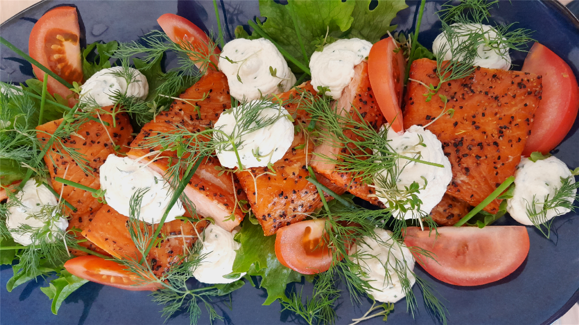 2 slags hvid fisk i forskellige rørte fiskesalater eller marinerede/røget